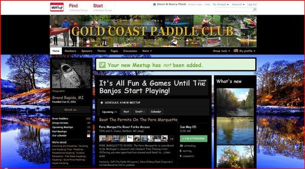 If you are an avid kayaker or canoeist looking to get out and meet others who share your passion, then you hav found the right place.The Gold Coast Paddle Club is an easy going group of experienced paddlers from the West Michigan area who enjoy paddling the many rivers Michigan has to offer. We are a very diverse group of boat owners which includes all ages and skill levels with both married and single members. There will be trips planned throughout the year, including camping in the spring/summer/fall and cold water paddles in the dead of winter. Since we seldom paddle where there are rental services, we welcome all paddlers who own or have access to a kayak or canoe to join Gold Coast Paddle Club. So what are you waiting for? If you have a boat sitting around, dust it off, load it up and let's go paddling!
