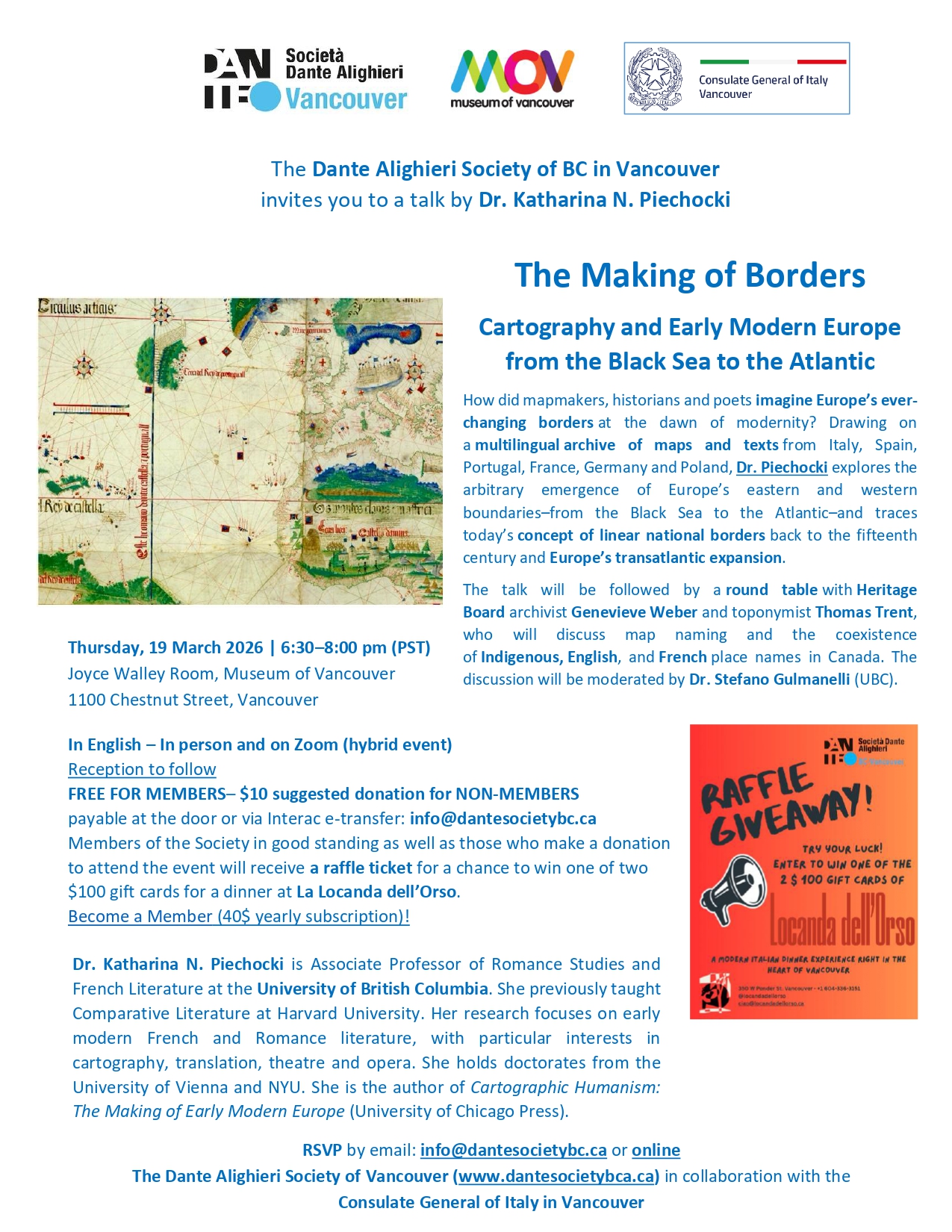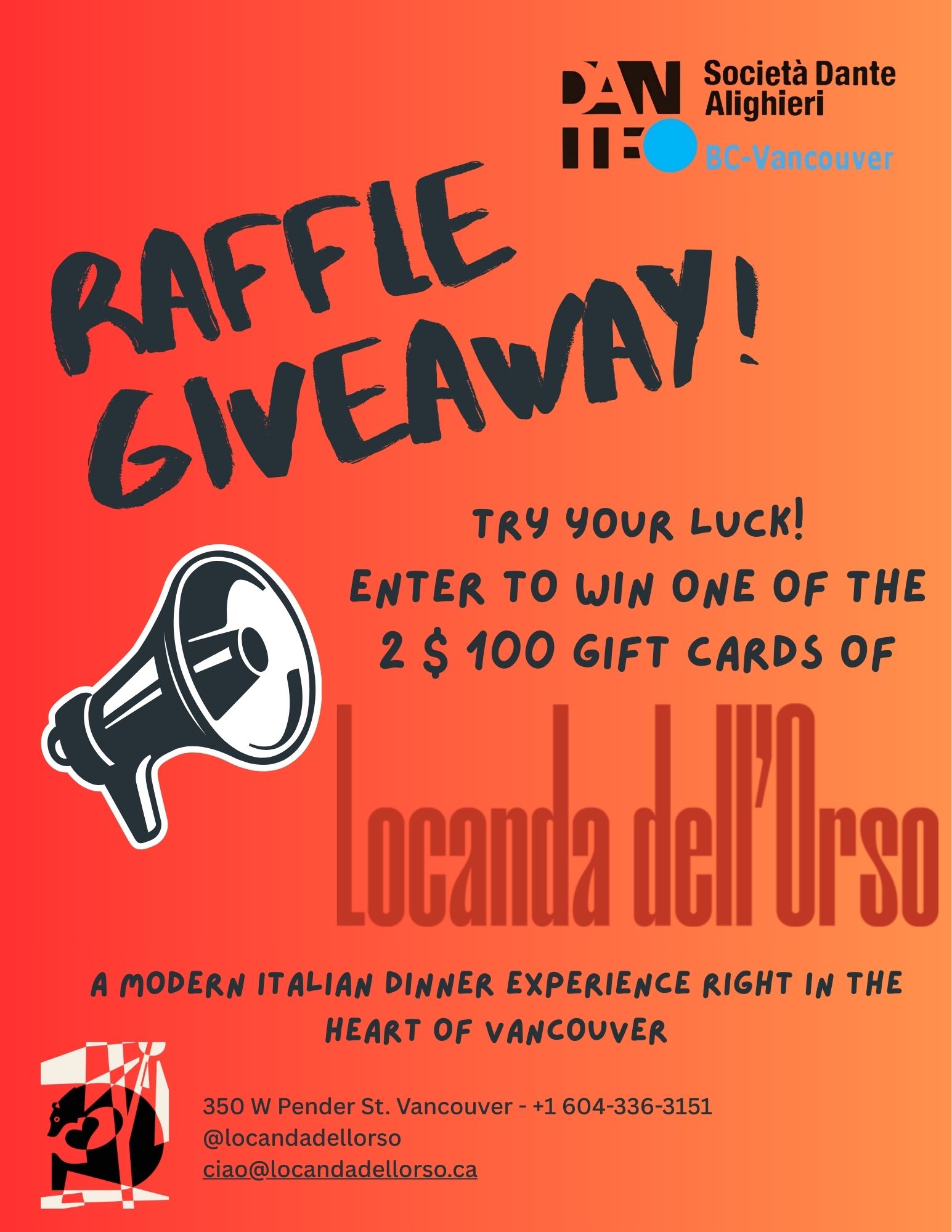 Members of the Society as well as those who make a donation to attend the event will receive a raffle ticket for a chance to win one of two $100 gift cards for a dinner at La locanda dell’Orso.